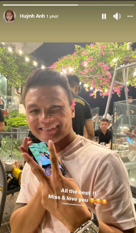 Điều đó được thể hiện trong đoạn video mà Huỳnh Anh vừa đăng tải trên Facebook cá nhân. Nàng WAGs đã ra sân bay Cam Ranh (Nha Trang) đón Quang Hải vào thăm. Anh chàng đeo khẩu trang kín mít, đeo kính, khoác balo thời trang rảo bước khiến nàng chạy theo không kịp. Huỳnh Anh không giấu được niềm vui nhưng vẫn tag tên chàng và giả bộ hỏi: "Ủa lạc đâu vô đây".
